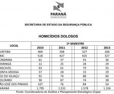 Nos municípios da Região Metropolitana de Curitiba, a taxa de homicídios caiu 37%, com o registro de 327 ocorrências em 2013, contra 518 no primeiro semestre de 2010. Uma das maiores quedas foi verificada na cidade de Colombo: 58%. Em São José dos Pinhais, houve uma redução de 50%.