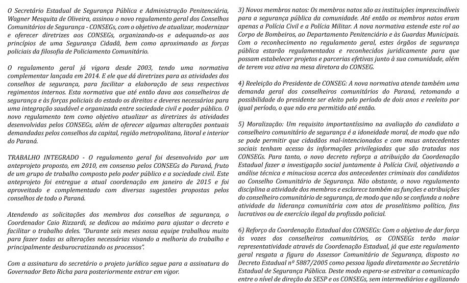 Tendo em vista o risco de manifestações violentas para a mesma data do Desfile Cívico de 7 de Setembro, e preocupados com a segurança dos participantes, a Coordenação Estadual decidiu cancelar a participação dos CONSEGs do Paraná no Evento.