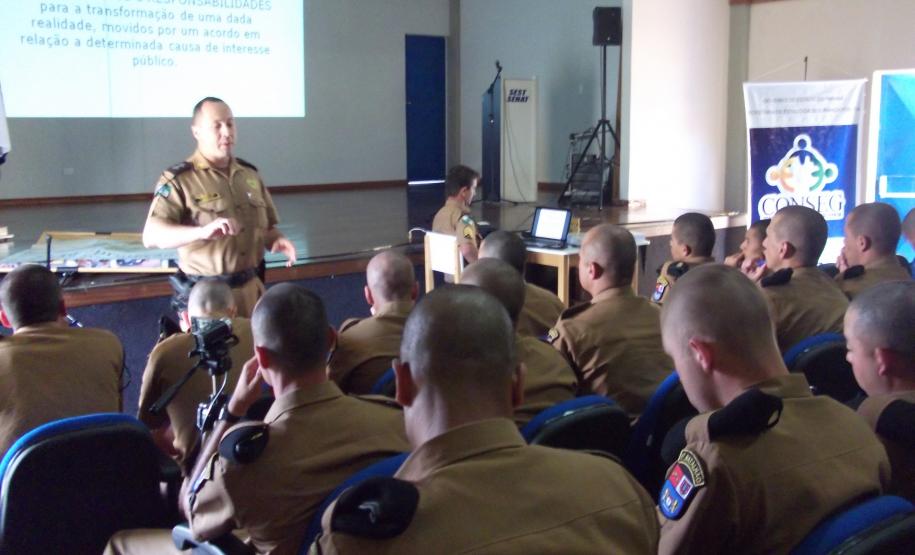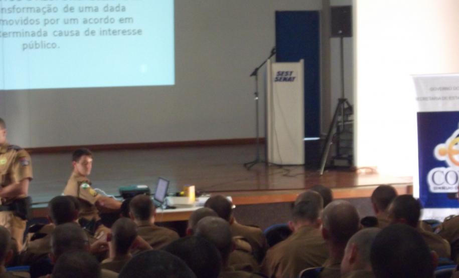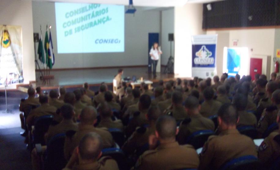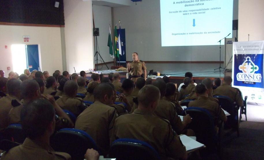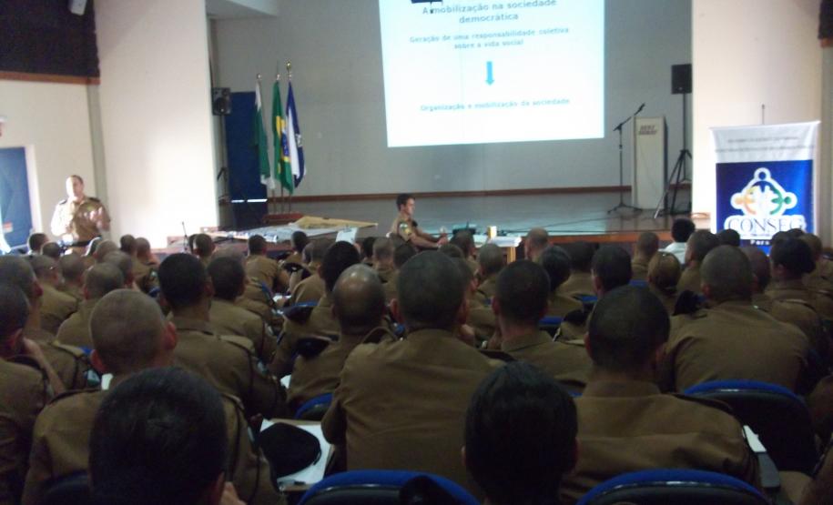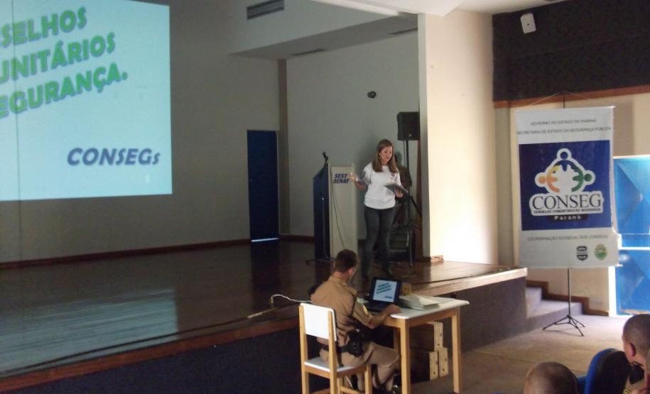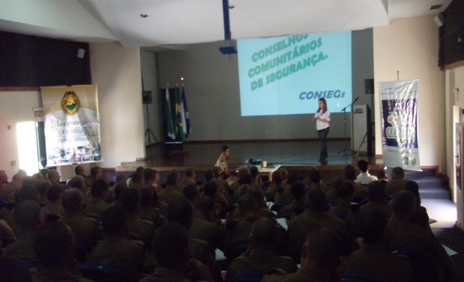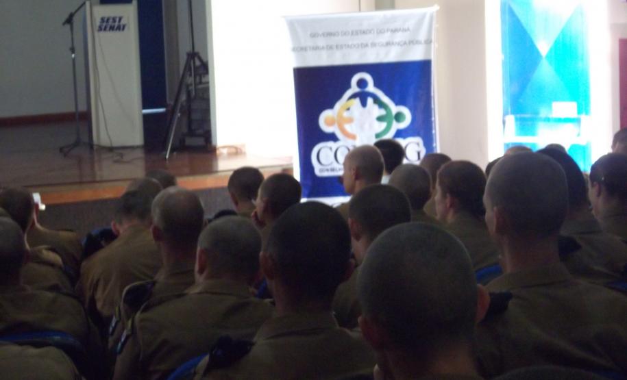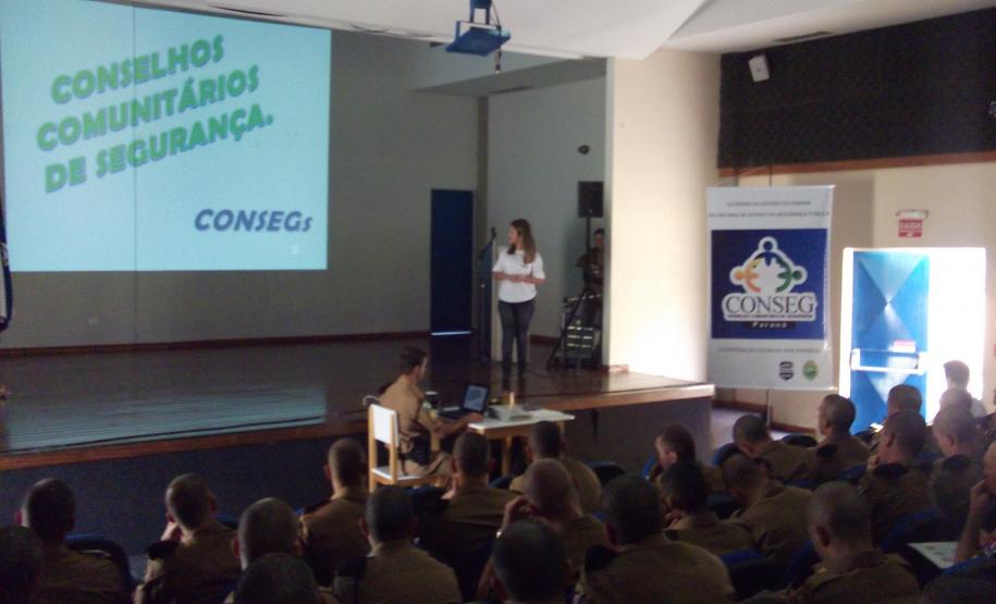 Proferiram a palestra a Coordenadora Michelle Cabral, o qual contextualizou a história dos CONSEG’s no Paraná, desde a década de 80, priorizando as boas práticas destes, focando no Policiamento Comunitário, após, ministrou o Representante da Polícia Militar, Ten. Nixon Gonzaga, com o tema Mobilização Social. Participaram da palestra, 106 soldados em formação. Para Michelle Cabral, esta iniciativa do comando do 1° BPM em convidar a Coordenação a passar a experiência adquirida dia a dia de convívio com a comunidade é 100% valida, ainda mais quando ao final de sua fala alunos interessados em aprender mais, nos procuram para tirar dúvidas, elogiar o trabalho realizado e se colocar a disposição para auxiliar e se integrar as comunidades. Por fim, ficou claro a eles que o CONSEG é uma grande ferramenta de ORGANIZAÇÃO E DE DESENVOLVIMENTO DA SOCIEDADE, bem como, do EXERCÍCIO DA CIDADANIA.