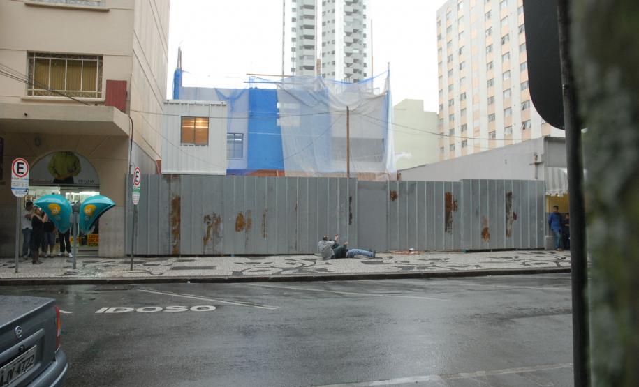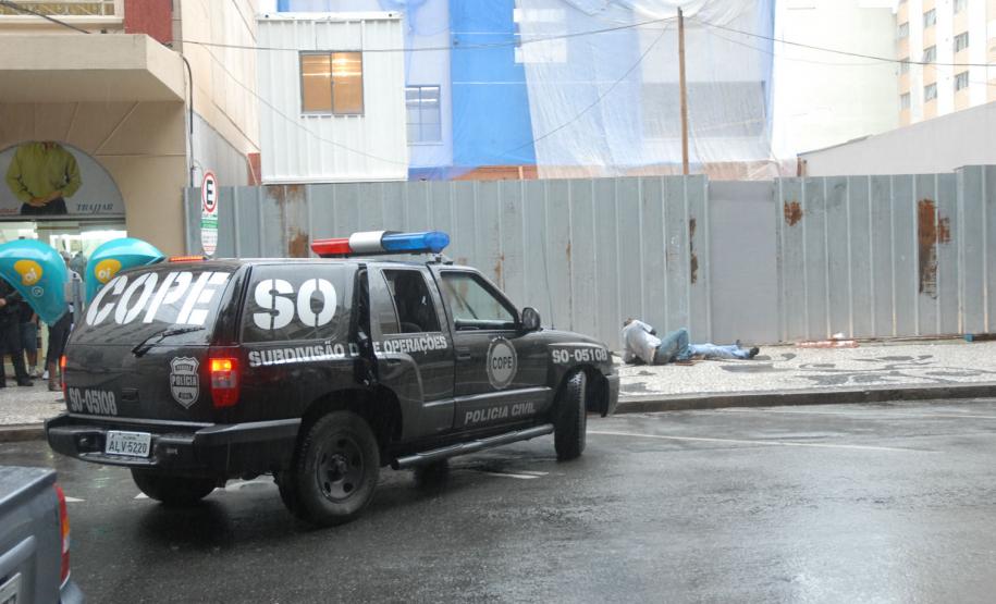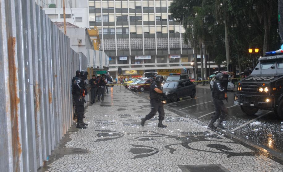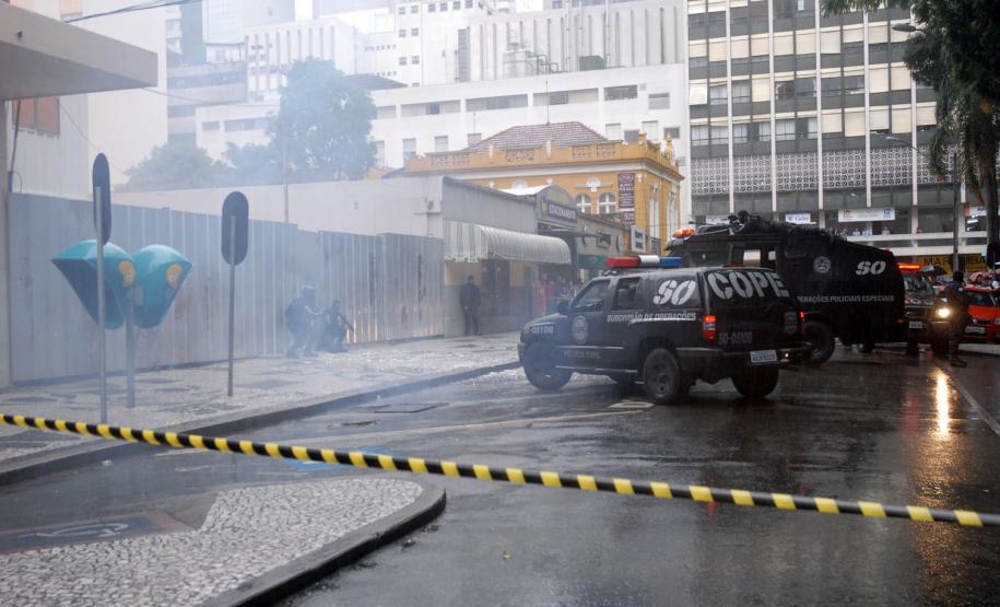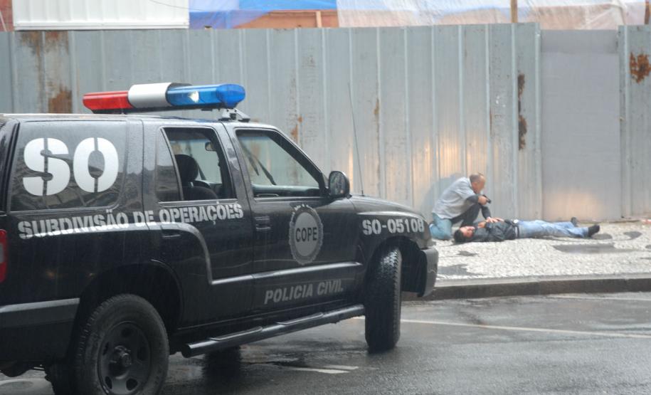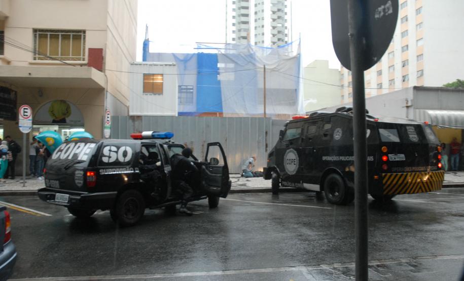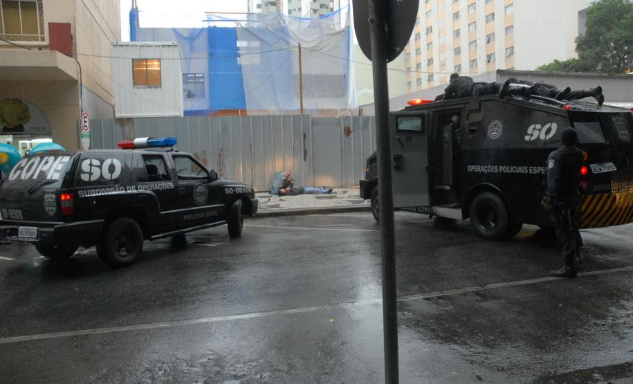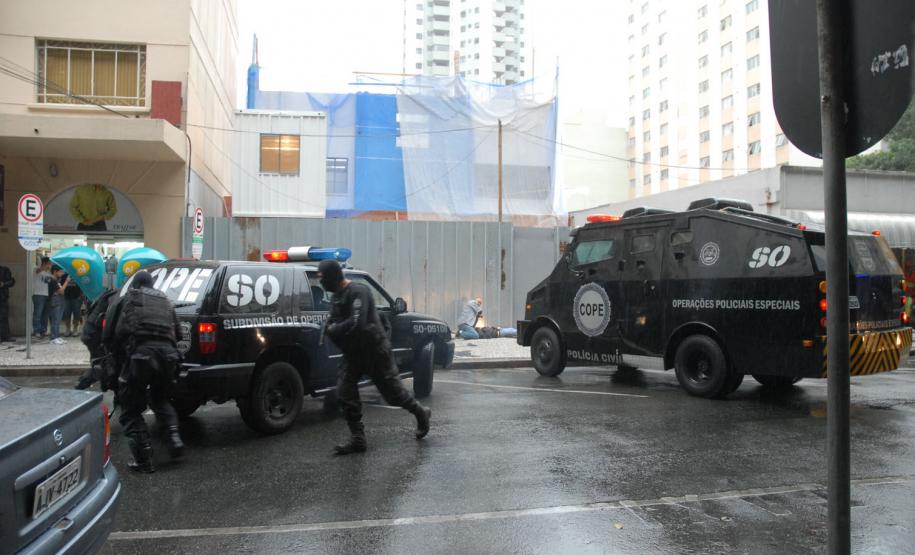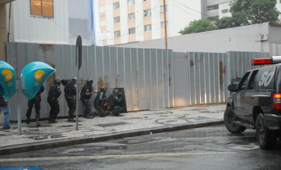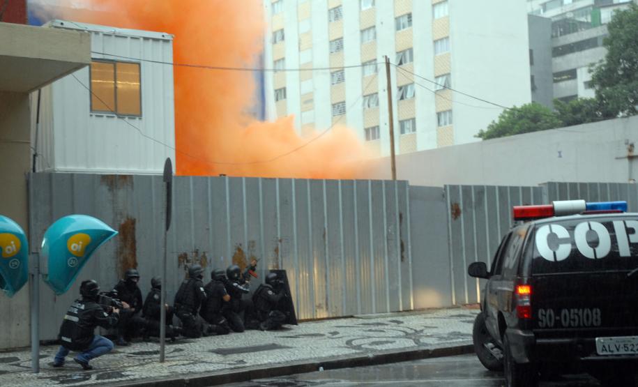 Policiais do Centro de Operações Policiais Especiais (Cope) realizaram, na tarde desta quinta-feira (7), um treinamento prático no Centro de Curitiba. Eles simularam a entrada numa casa dominada por bandidos especializados em roubos a bancos e carros-fortes. Houve confronto, troca de tiros e um policial foi baleado. Então os policiais simularam também o atendimento ao colega ferido. A equipe pediu reforço e esse outro grupo de policiais ficou responsável por invadir a casa explodindo uma das entradas. Houve nova troca de tiros e os policiais enfim prenderam os marginais. “Fizemos um adentramento tático de invasão, arrombamento com explosivos e simulação de policial ferido com APH tático”, explicou de forma técnica o delegado titular do Cope, Hamilton da Paz.