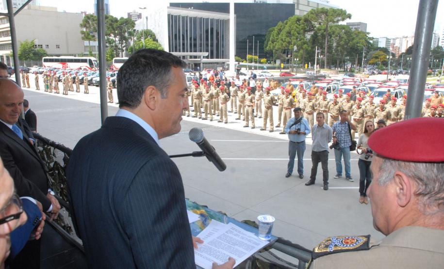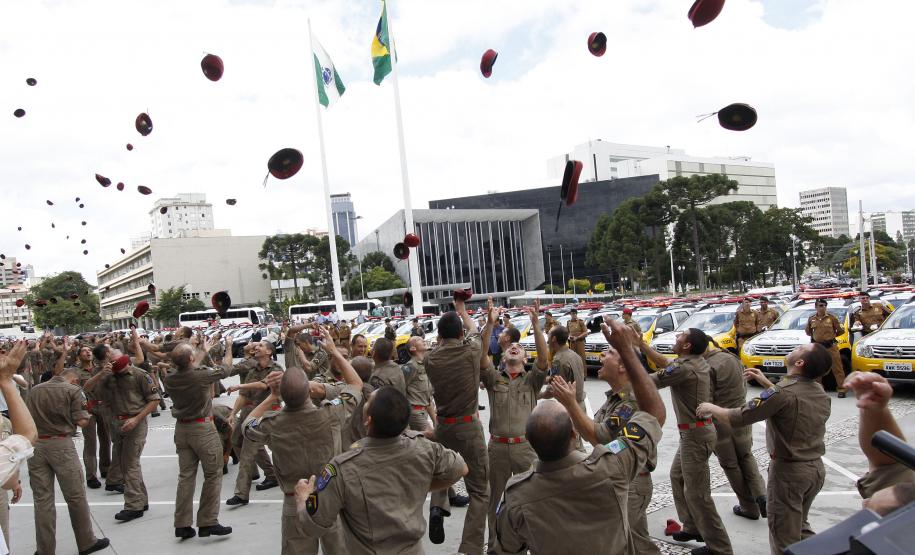 VIATURAS - Durante a solenidade, realizada em frente ao Palácio Iguaçu, o governador entregou 185 viaturas para as polícias Militar e Civil para as regiões de Curitiba, Foz do Iguaçu, Ponta Grossa e Maringá. Deste total, 172 são para os batalhões da Polícia Militar e 13 para a Polícia Civil da capital.