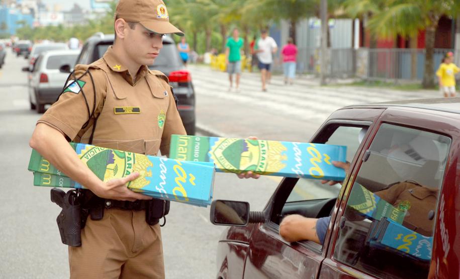 Em menos de duas horas, mais de três mil para-sóis para automóveis foram entregues por policias militares no Litoral paranaense na manhã do último sábado (26/01). A iniciativa é fruto da diretriz de policiamento comunitário e integra as atividades da Polícia Militar na Operação Verão. Os materiais estão sendo entregues nas ruas, nas entradas dos balneários, nas viaturas e nos módulos móveis da PM.